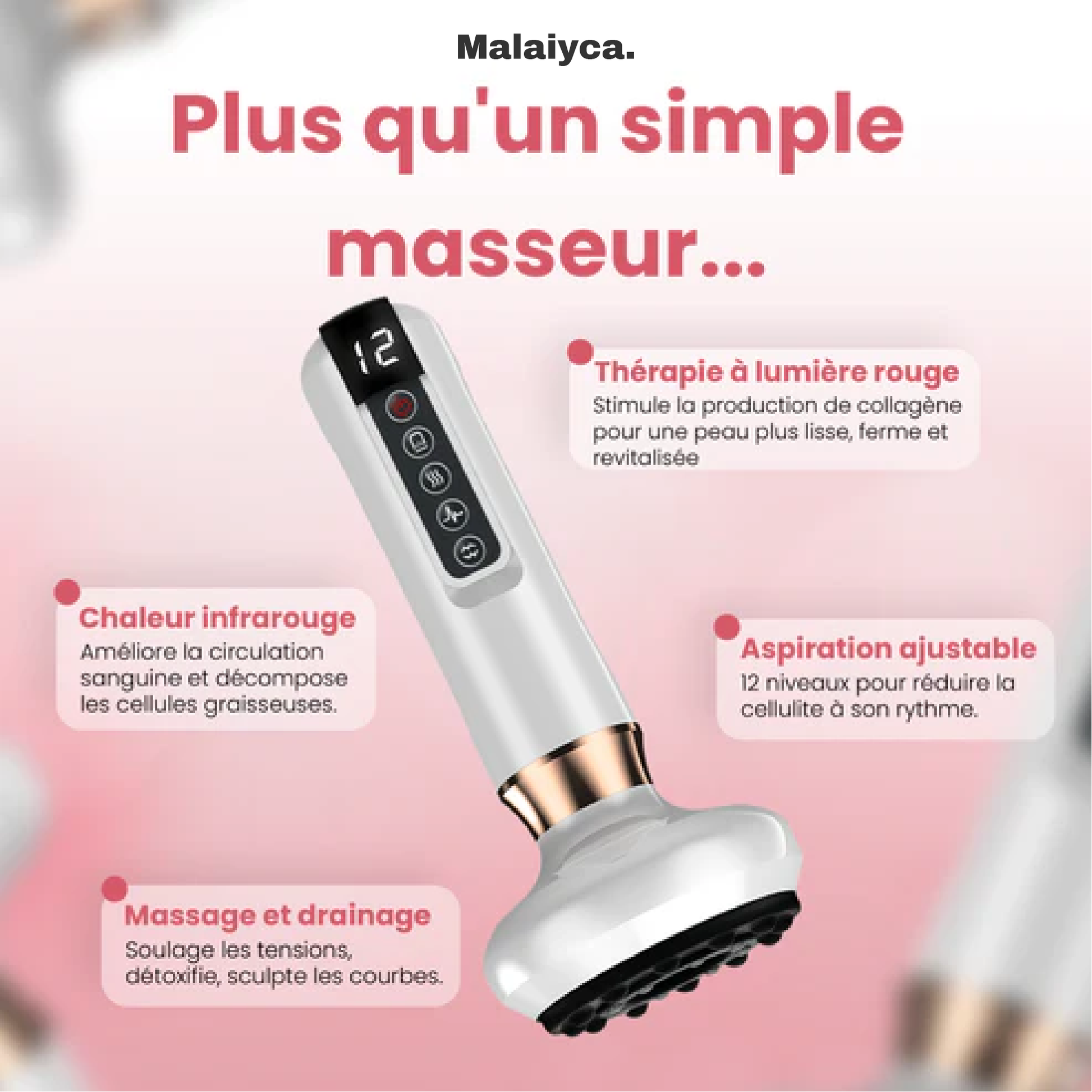 Recommandé par le Dr Lara Schwinz , experte en dermatologie, le masseur Malaiyca utilise une thérapie par aspiration avancée pour réduire significativement la cellulite. Une utilisation régulière aide à décomposer les graisses, améliorer l’élasticité et réduire les inflammations, pour une peau lisse et ferme. Testé et approuvé par des consommateurs, Malaiyca offre des résultats visibles et un teint sublimé.